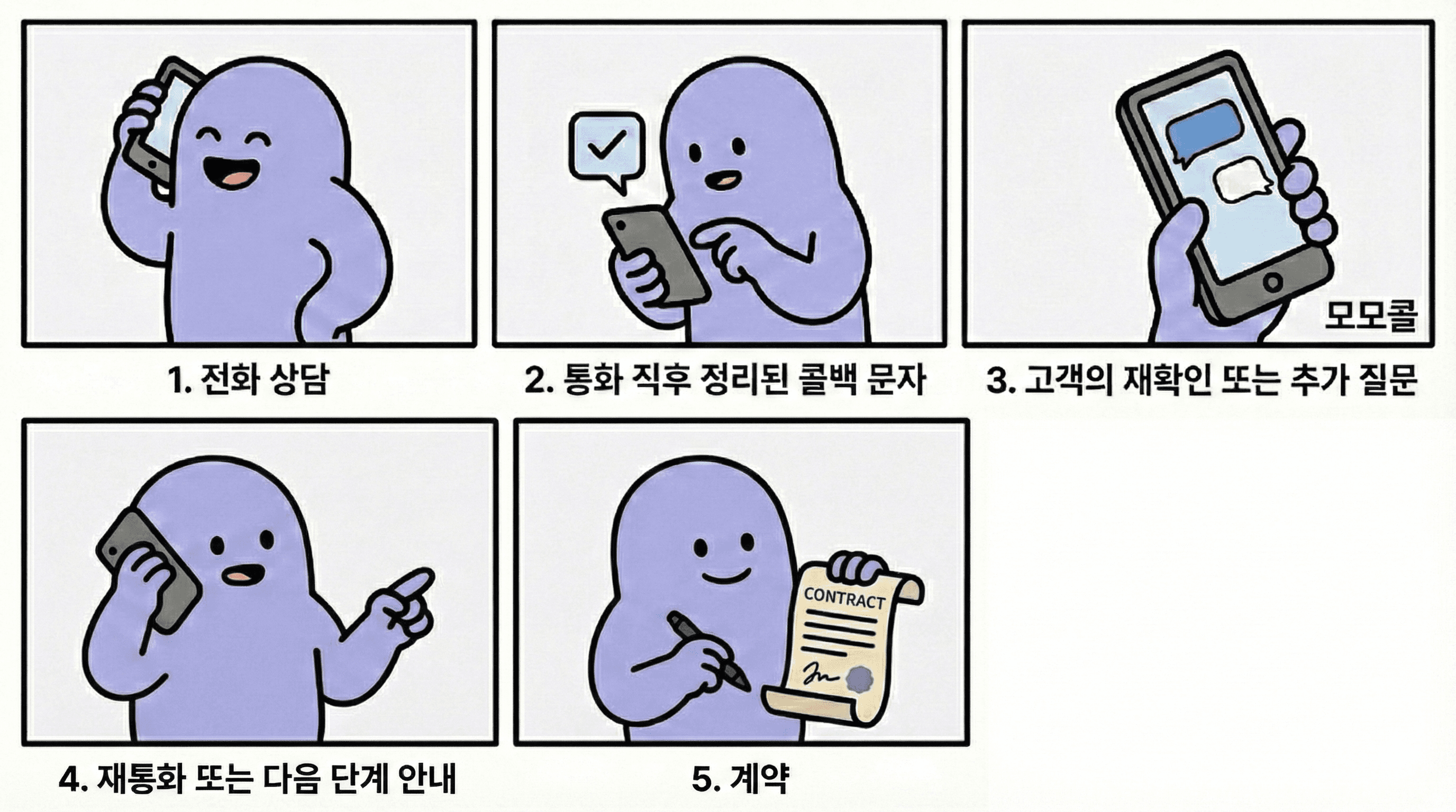 1. 전화 상담 > 2. 통화 직후 정리된 콜백 문자 > 3. 고객의 재확인 또는 추가 질문 > 4. 재통화 또는 다음 단계 안내 > 5. 계약