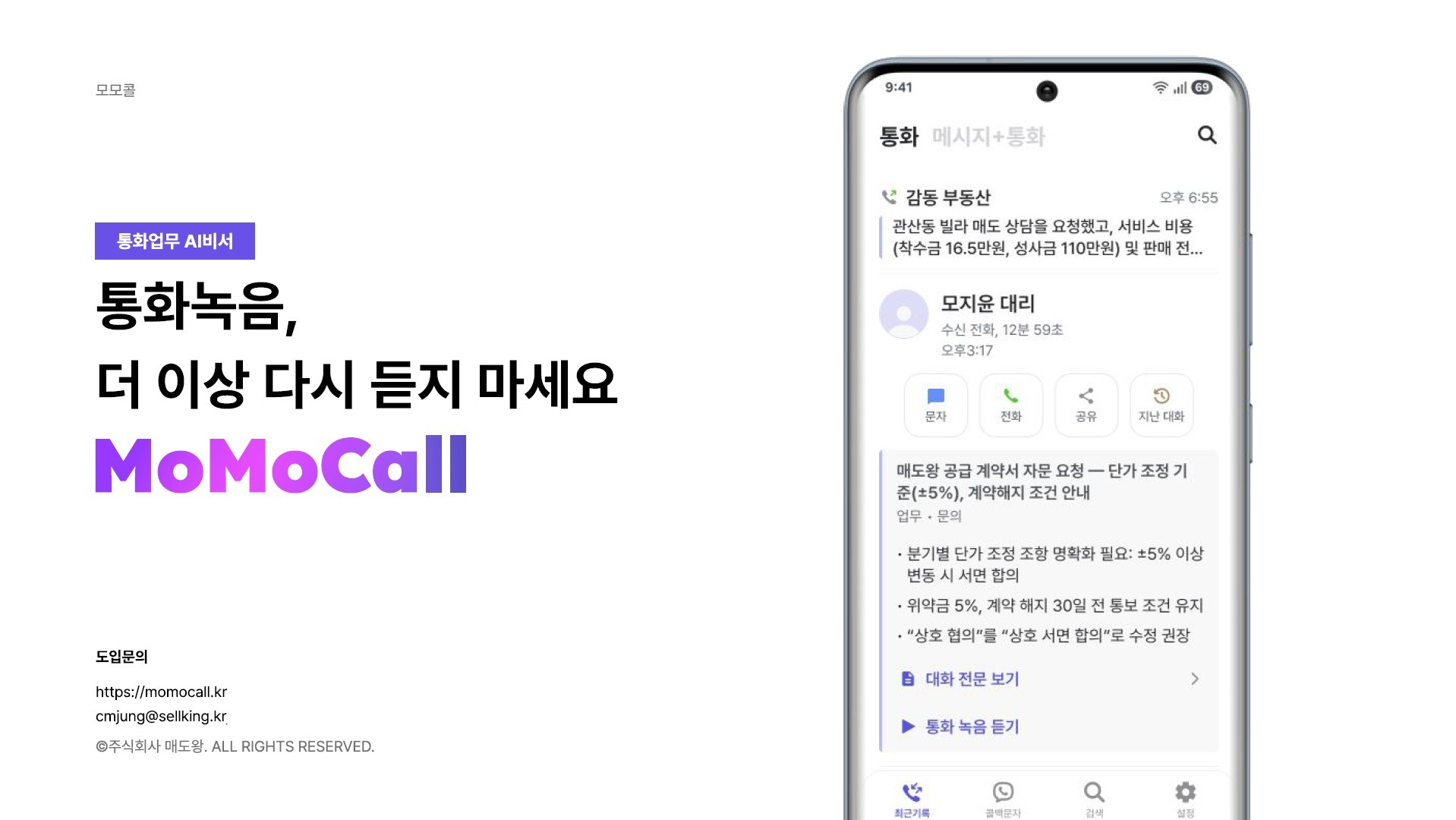 모모콜은 갤럭시 통화녹음 내용을 기반으로 고객관리, 콜백문자, 명함 전송, 일정등록을 자동으로 해주는 앱입니다.